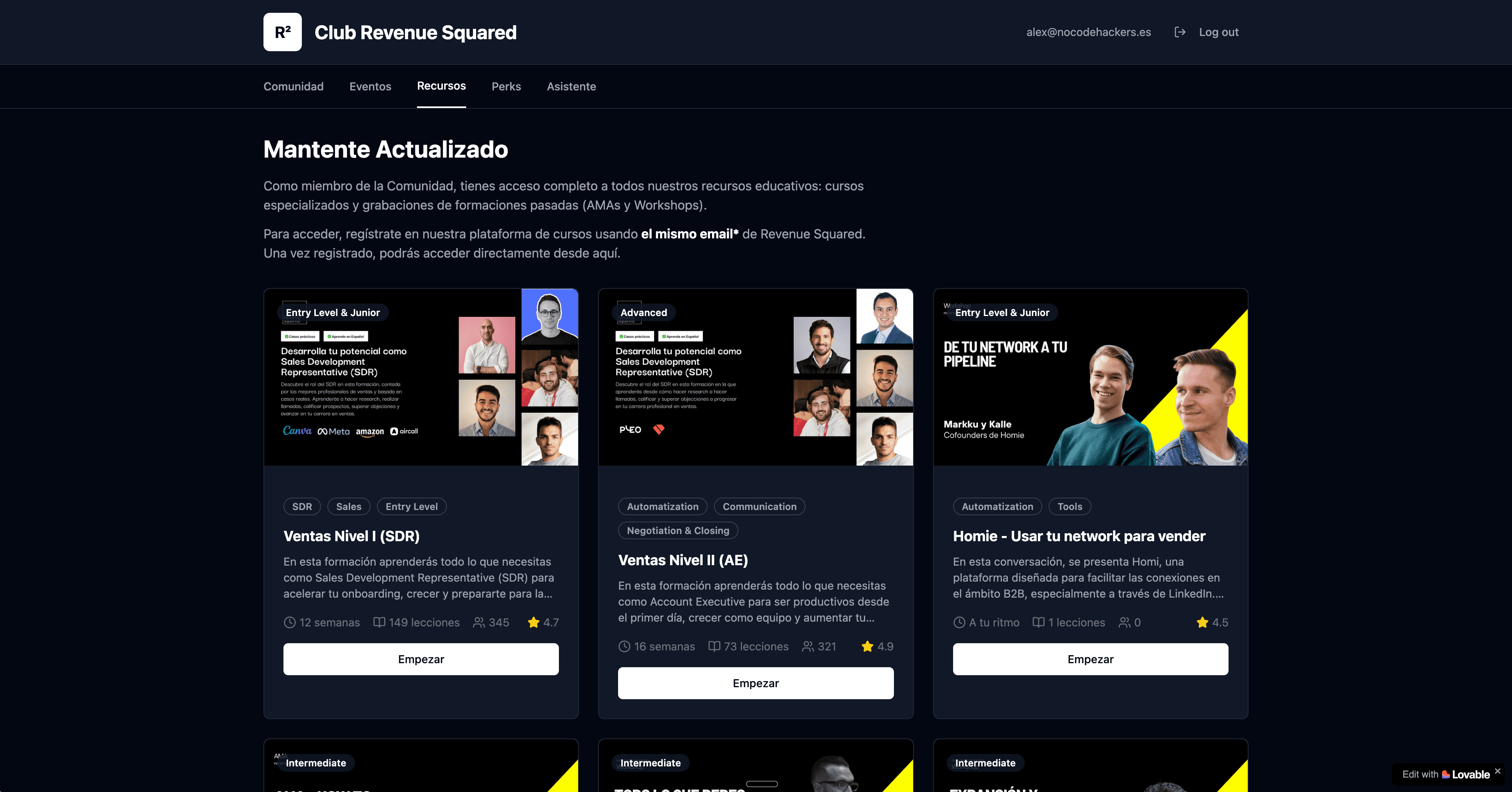 RevenueSquared, la mayor comunidad de ventas de España y cliente de la agencia desde sus principios, contaba con una plataforma interna que funciona como área privada, diseñada para ofrecer a sus miembros acceso privado a recursos, a otros miembros de la comunidad, enterarse de los eventos y hacer de HUB principal de la propia comunidad, recopilando en un único lugar el acceso a las diferentes herramientas